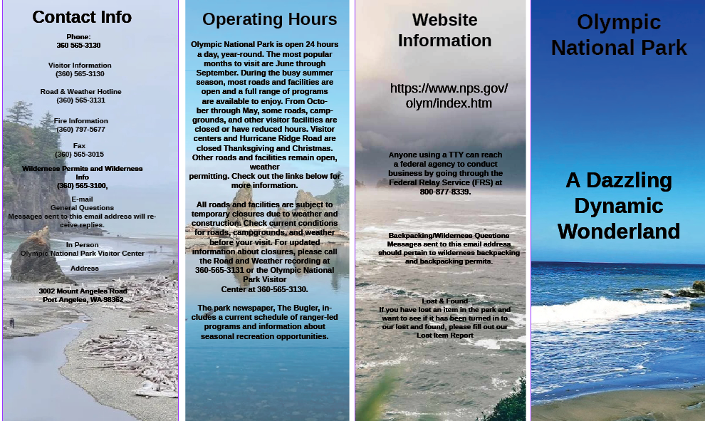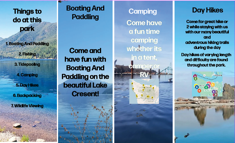 Folded Brochure: For my second portfolio project I did a folded brochure for limping National Park which I originally started to do in my typography class I was just say it didn’t end well so I redid it in portfolio assessment to make it look more professional, concise and perfect and I think it turned out well, and I really put a lot of effort and time into it. The creative process behind this was to make it appealing, interesting, creative, and consistent with the information that I found on the website. I decided to put all of the information on one page each for the brochure to make it look organized and consistent, and pretty.