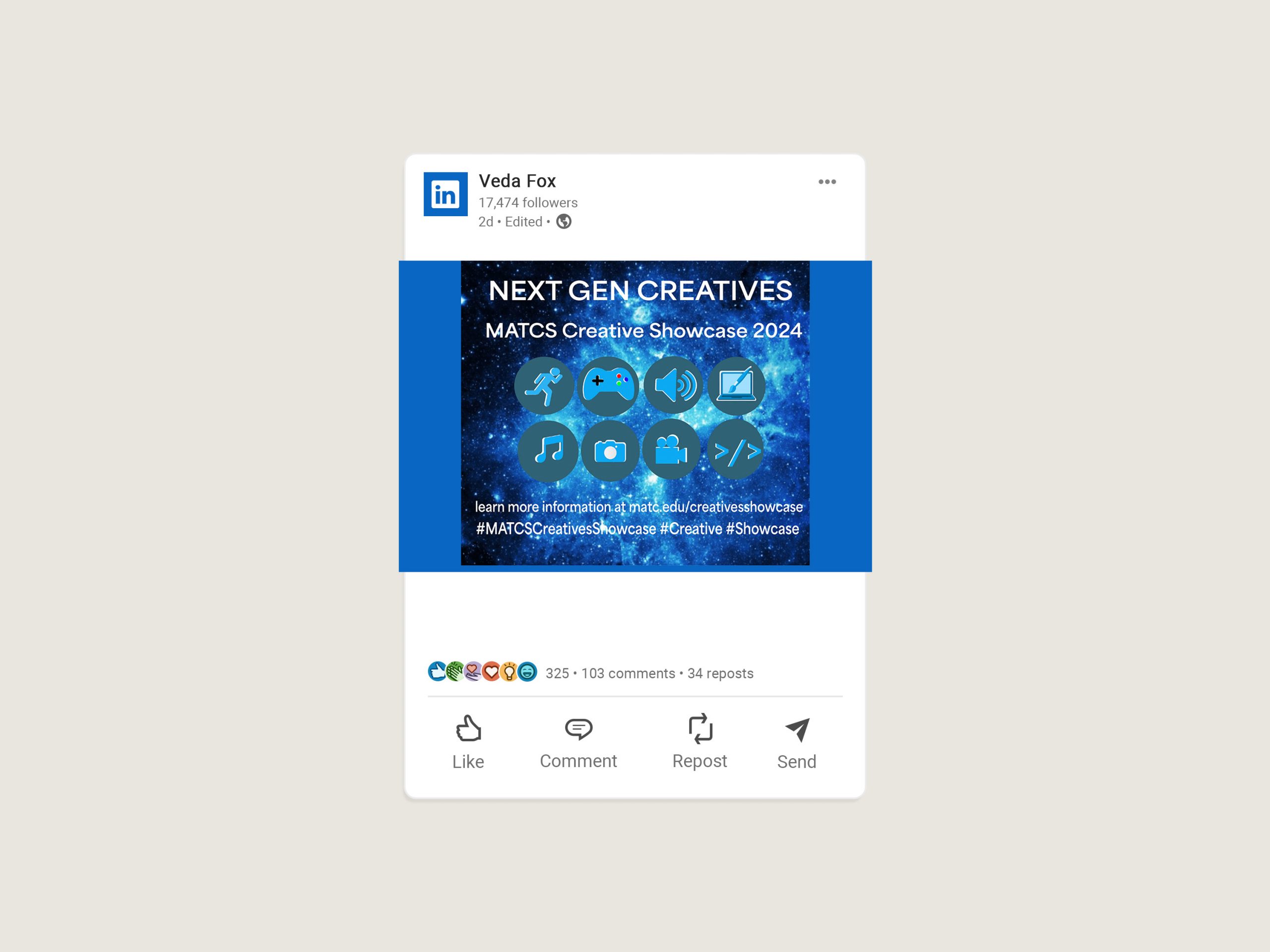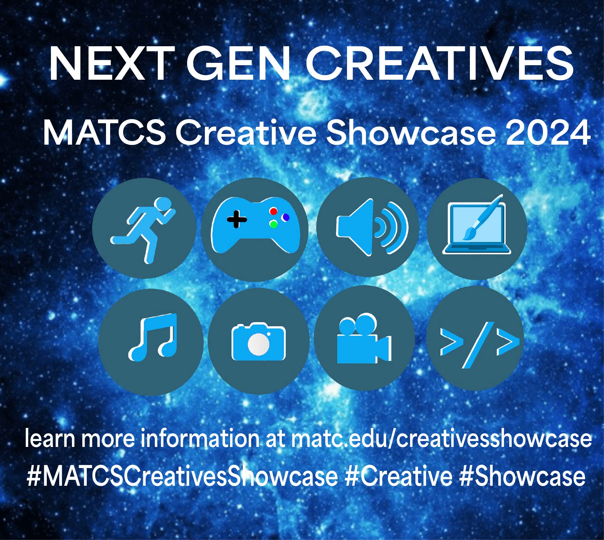 Portfolio Night Next Gen:  The creative process for this project was to get me thinking about hopefully a night at MATC and I decided to make the icons look really pretty and add a Galaxy theme to it to make it look futuristic for the Next Generation because you never know what’s going to happen with the Next Generation so I thought the Galaxy background would make it look futuristic as well as the icons.