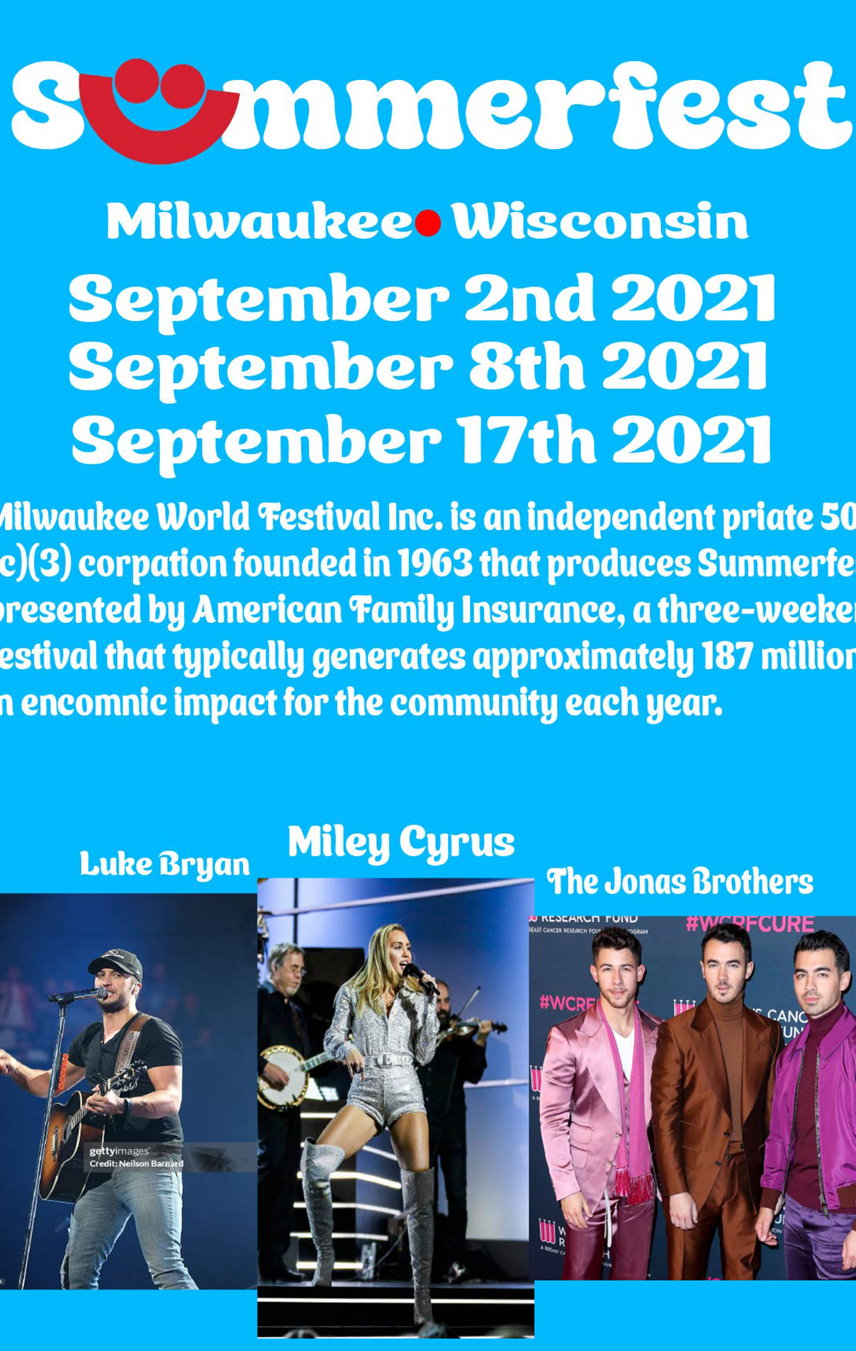 Summerfest Poster: For this project, I got to do a poster for Summerfest and include all the headliners that were there, and I absolutely loved how this turned out. I love the blue background, and I love that I spaced out all of the headliners and made the poster look cool and unique. And that was the creative process behind it.